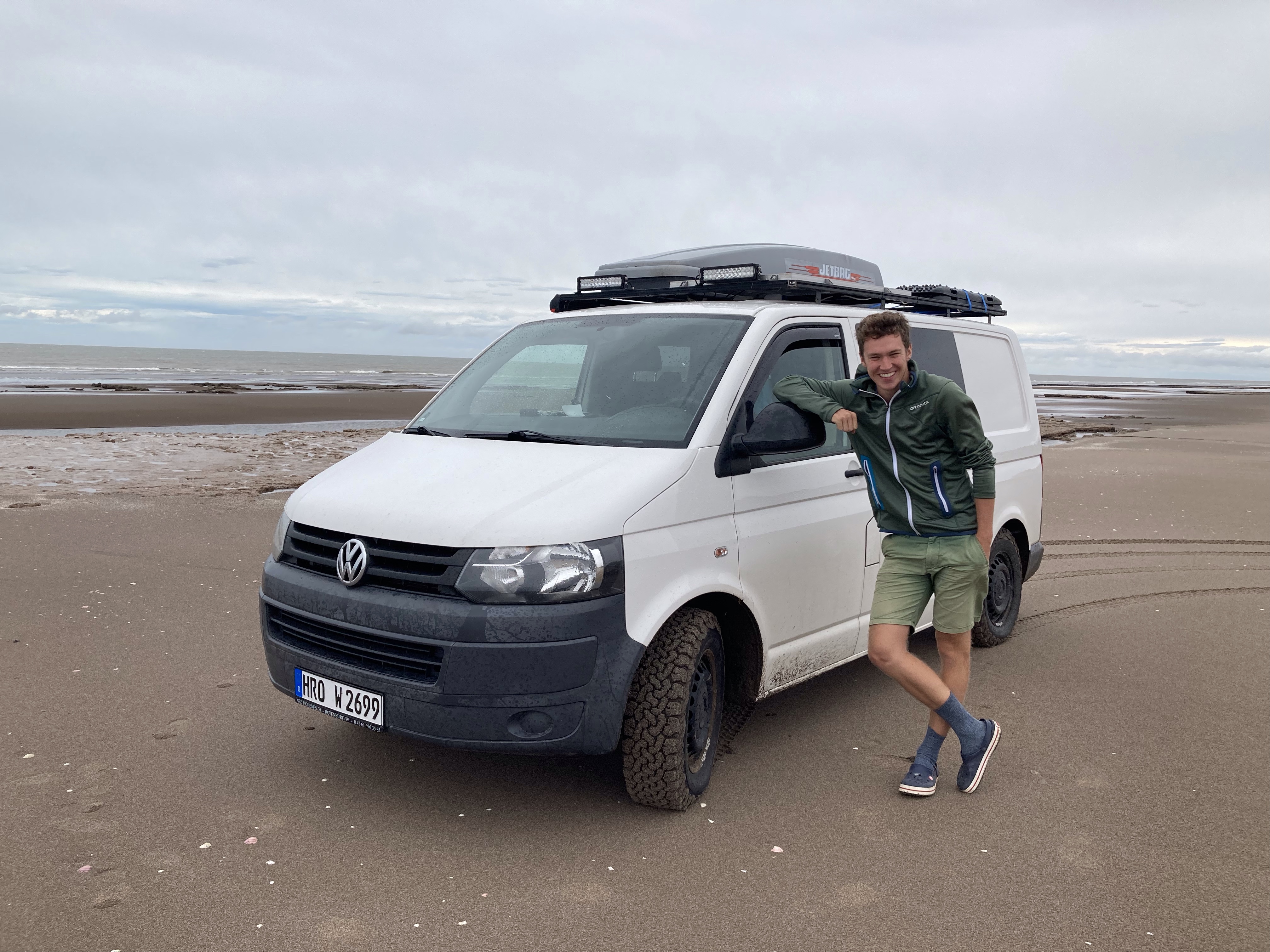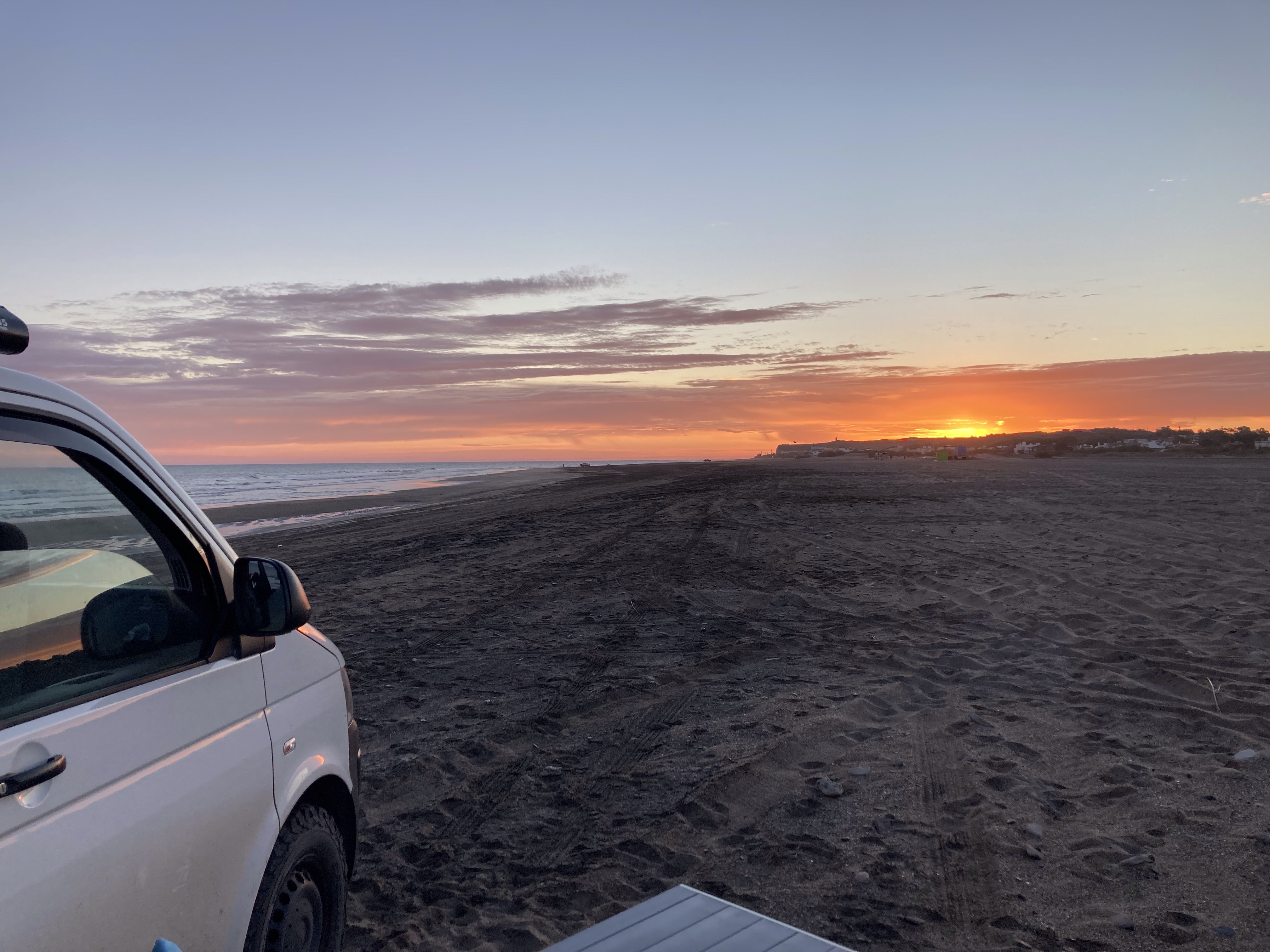 Nach einigen Recherchen in einschlägigen Apps ergab sich die Möglichkeit die Straße durch eine 6,5 km lange Strandetappe zu umfahren. Wir standen also vor Wahl umzudrehen und somit die 60 km über die desaströse Piste zurückzufahren, oder eben die Strecke über den Strand zu versuchen. Nach einigem hin und her entschieden wir uns für die Strandpassage. Dabei war uns bewusste, dass uns an diesem Tag eventuell kein Fahrzeug mehr auf dem Weg begegnen könnte und die einsetzende Flut den befahrbaren Strand immer kleiner werden ließ. Die 6,5 km am Strand unter 50 km/h im zweiten Gang waren die aufregendsten Kilometer bis hierher. Einige Male verlor der Bulli trotz durchgetretenen Gaspedals bedrohlich an Fahrt und wir sahen uns schon wieder mit der Schaufel in der Hand. Mit einem lauten Jubelschrei erreichten wir das „rettende Ufer“