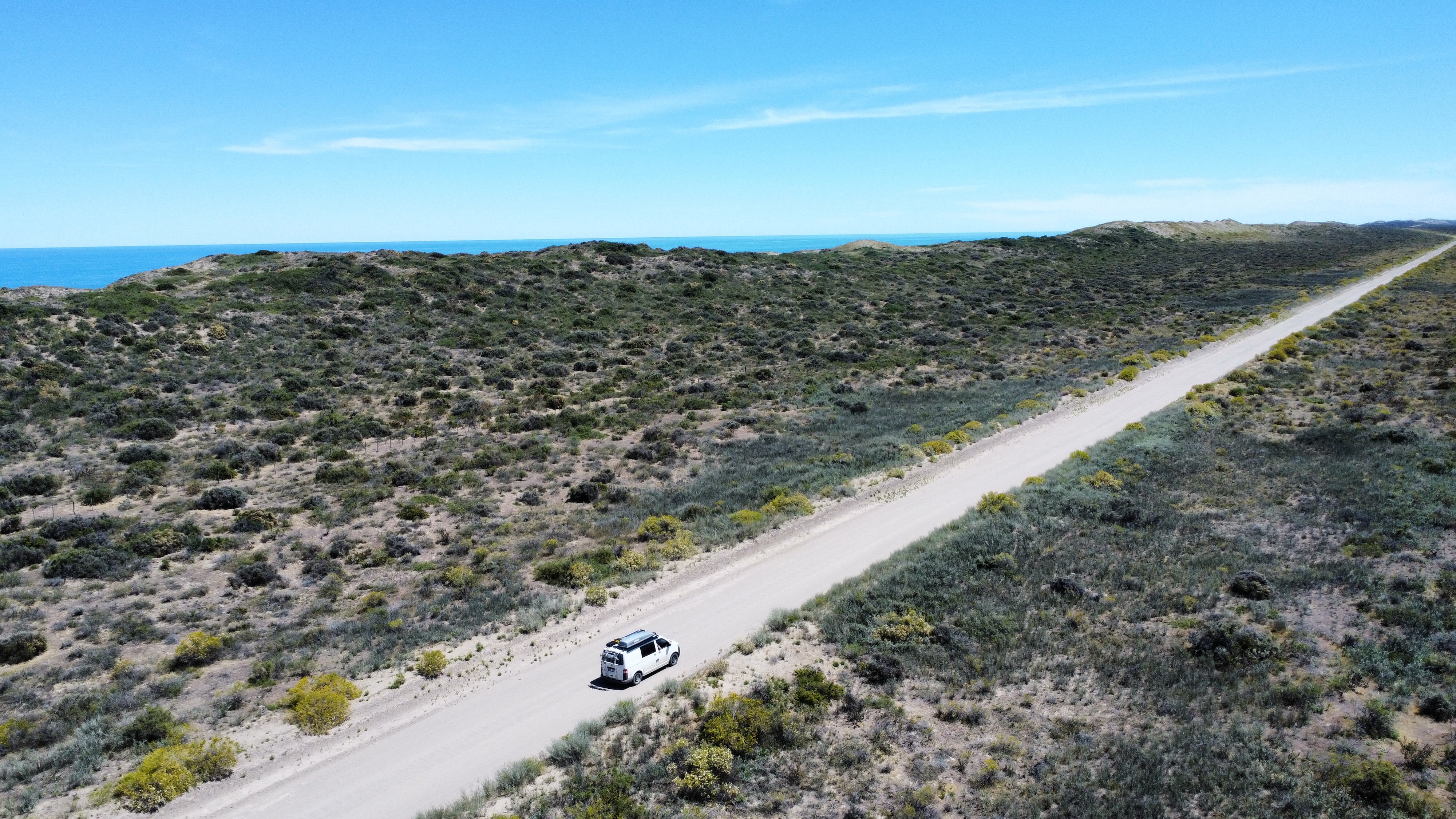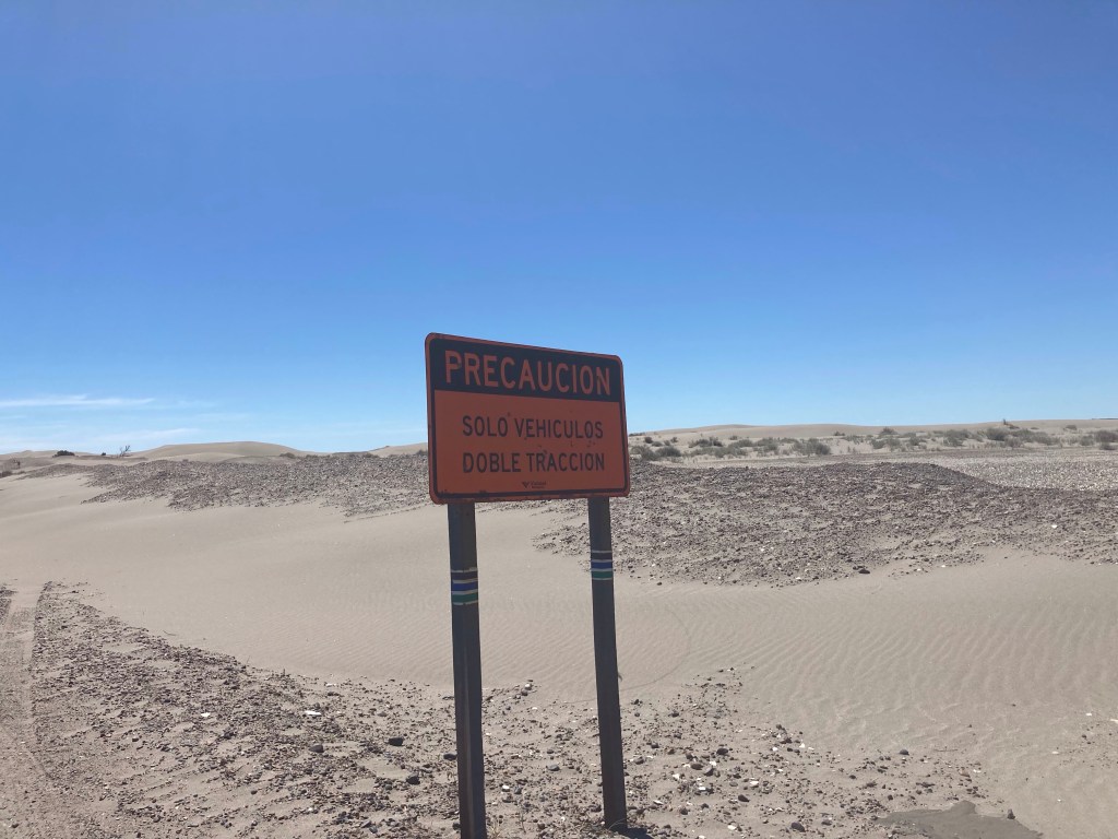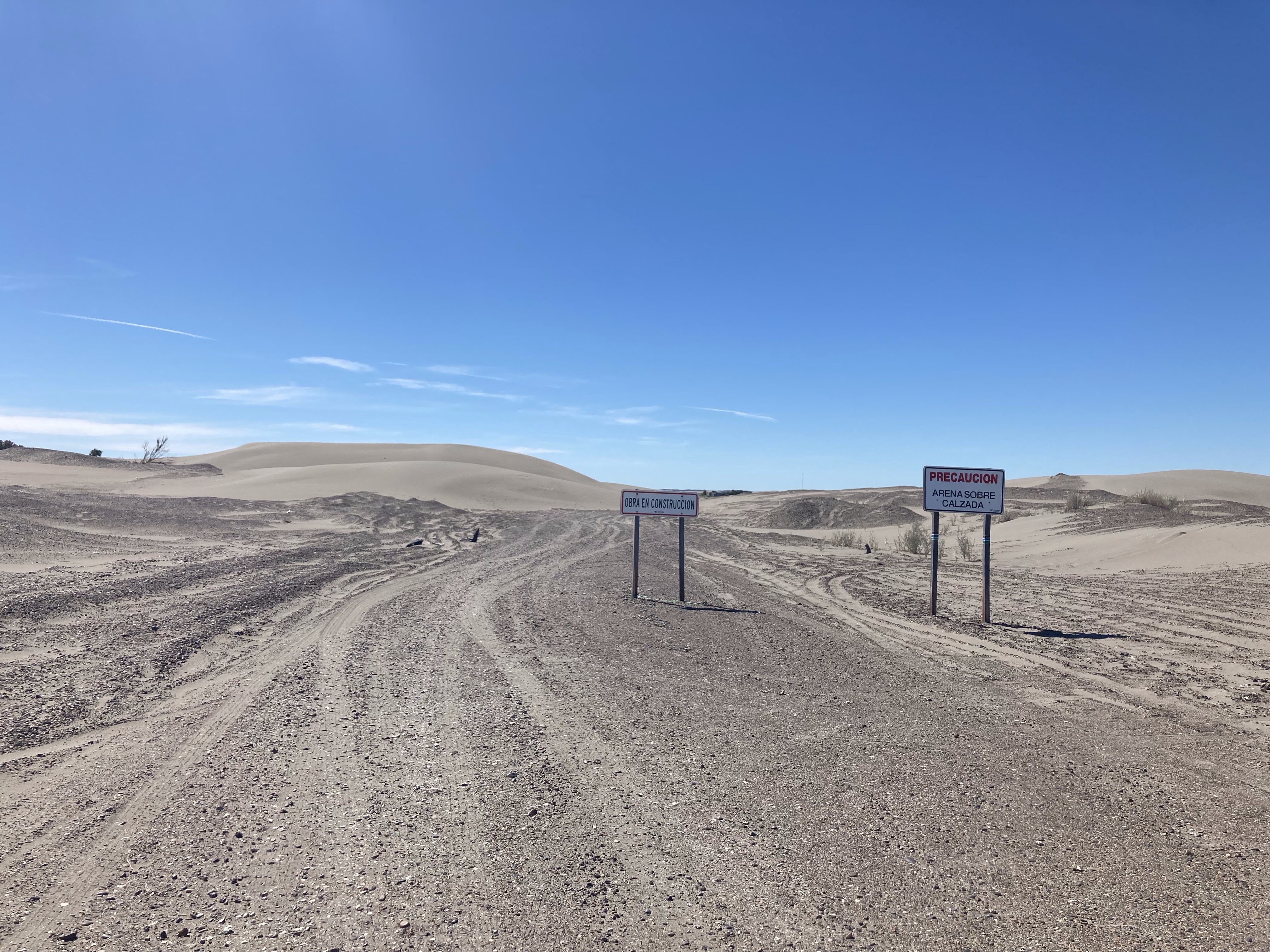 Von El Condor fuhren wir die Küstenstraße direkt am Atlantik entlang. Was als wunderbar geteerte Straße anfing mündete nach nur wenigen Kilometern in einer Wellblechpiste, auf der die maximale Geschwindigkeit, die man sich und dem Fahrzeug zumuten wollte, nicht mehr als 30 km/h betrug. Nach einer längeren Pause stießen wir auf die ersten Warnhinweise, dass die weitere Straße nur für Allradfahrzege befahrbar sei. Beim Blick um die nächste Ecke sahen wir aber, dass selbst ein Allrad-Reisemobil diese Passage nicht meistern würde: die Straße wurde durch eine über 8 m Hohe Sanddüne versperrt.
