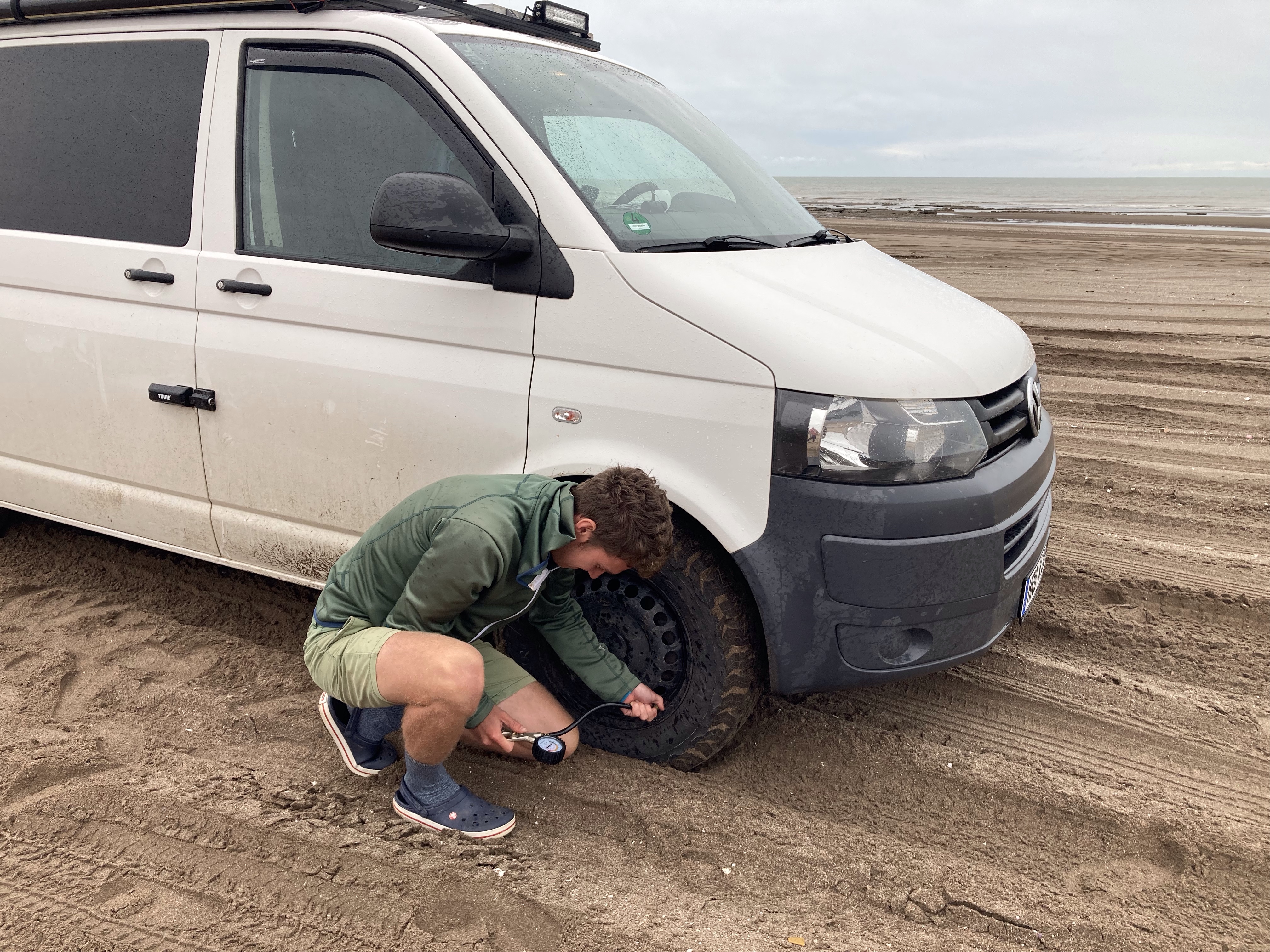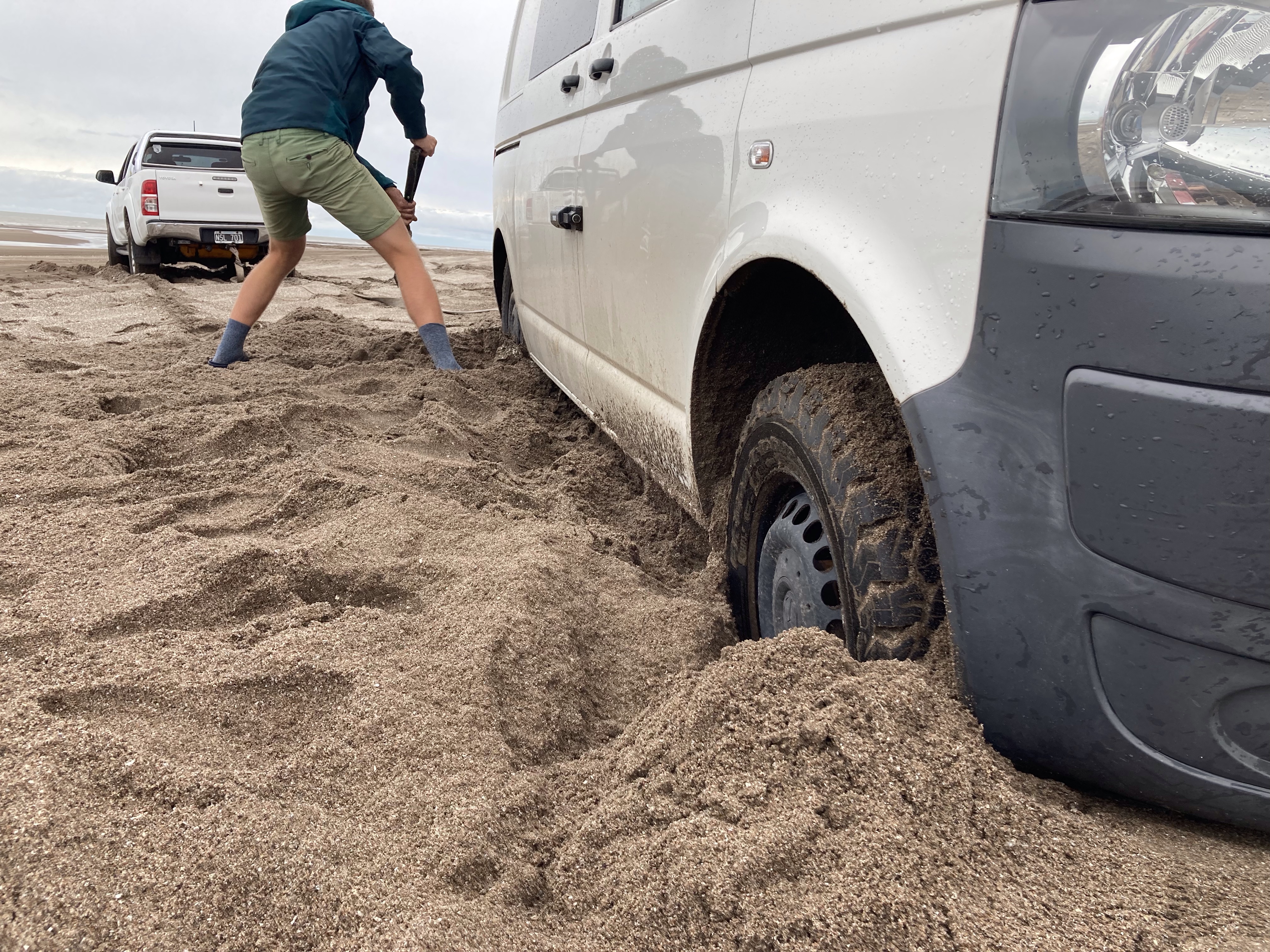 Am nächsten Morgen fuhren wir im strömenden Regen an den Strand Monte Hermoso. Nachdem es am Nachmittag aufklarte und sämtliche Pickups und Geländewagen über den Strand bretterten, wollten auch wir unsere Geländegängigkeit testen. Der erste Versuch endete nach 20 Metern. Eine Schaufeleinheit und das erste Mal Luftablassen später waren wir zurück auf der Straße. Für den nächsten Anlauf reduzierten wir erneut den Reifendruck und probierten es mit etwas mehr Gas. Nachdem wir den weichen Sand passiert hatten, lief es auf dem härteren Sand in der Nähe des Wasser richtig gut. Wir vertrauten den Offroadfähigkeiten unseres Autos Runde für Runde mehr, und wagten nun abermals einen Versuch durch den weichen, lockeren und tiefen Sand, der sich unmittelbar neben der festen Piste nahe des Meeres befand. Die Fahrt nahm ein jähes Ende, als das ESP sich einschaltete und das noch fahrende Auto zum Stillstand brachte. Die Vorderräder hatten sich ziemlich tief in den Sand gegraben. Also holten wir wieder unsere Schaufel raus und legten den Bulli Stück für Stück frei. Schon nach kurzer Zeit hielt ein Pickup direkt neben uns, der uns ohne Umschweife und ohne Chance zur Widerrede seine Hilfe anbot. Ehe wir uns versahen hatten wir ein Abschleppseil an der Anhängerkupplung und befanden uns wieder auf festerem Untergund.