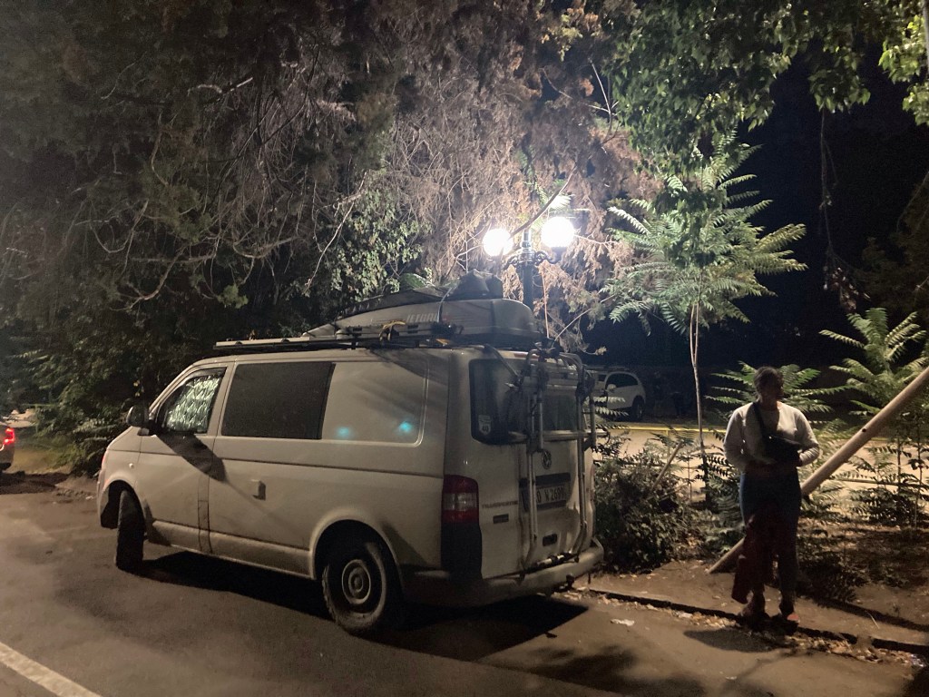 Wir fahren in den Abendstunden nach Santiago de Chile, das sich vor der Andenkette ausgebreitet hat. Unsere Sorge, in der Großstadt keinen geeigneten Stellplatz für unseren Bulli zu finden, stellt sich als nicht begründet heraus. Durch einen Eintrag in der App iOverlander stoßen wir auf einen Platz in einer ruhigen Straße direkt am Fuße des Cerro San Cristobal, einem sehr großen Stadtpark im Norden der Stadt. Tagsüber gibt es Parkwächter und nachts fährt eine private Security-Firma durch die Straßen. Wir fühlen uns wohl damit unser Auto hier alleine zu lassen und können beruhigt die Stadt erkunden.