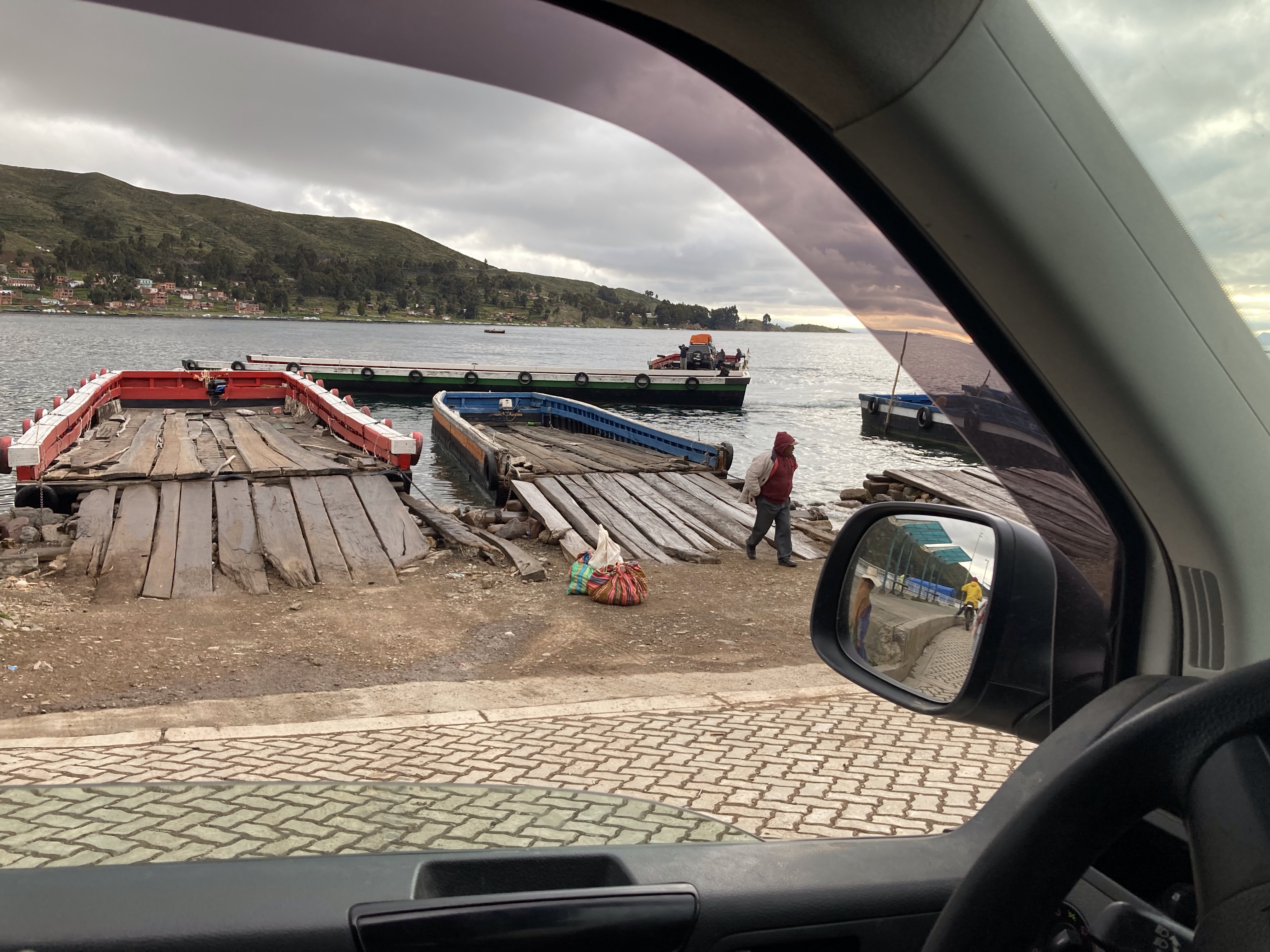 Eine Stunde später erreichen wir den Tiiticacasee, mit einem Fährponton setzen wir über und frühstücken im Örtchen Copacabana.