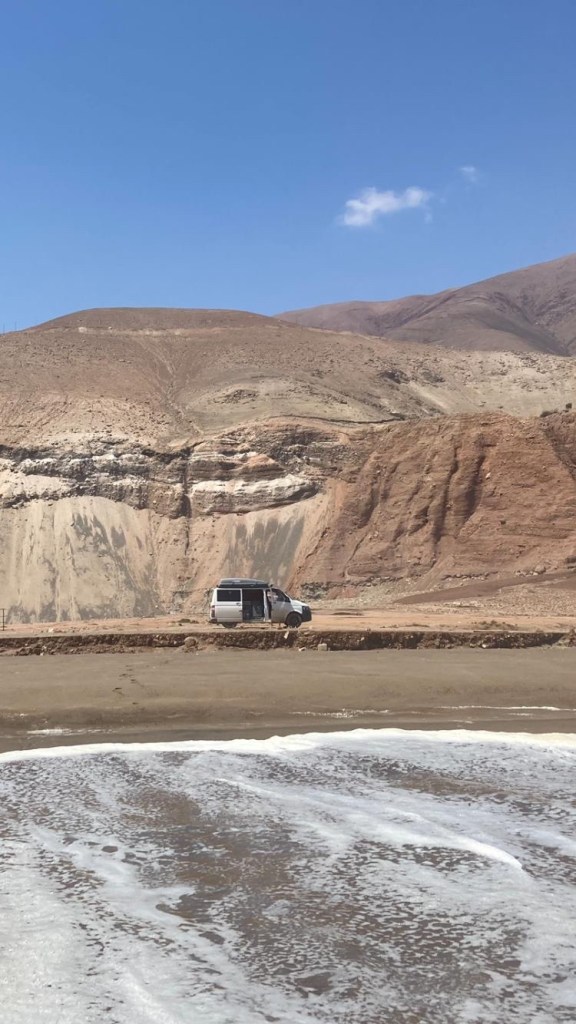 Wir sind sehr erleichtert, dass unser Armaturenbrett nicht mehr aussieht wie eine Discokugel und fahren zum Schlafen auf einen Strandparkplatz. Wir verbringen zwei Tage am Strand und haben einen coolen Stellplatz an einer kleinen Bucht, wo außer uns nur Fischer sind.