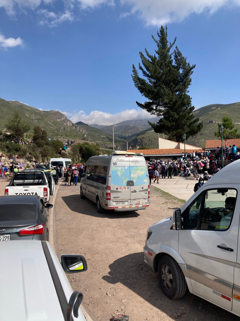 Wir erfahren, dass es um die Wasserrechte geht: große Teile des Wassers in Peru sind privatisiert und die Bauern protestieren dagegen. Der Protest scheint uns gerechtfertigt zu sein. Allerdings erfährt Moritz von einer Frau vom Katastropghenschutz, dass ein Erdbeben im Kolka-Canyon die Straße und rund 100 Häuser völlig zerstört hat. Die Menschen dort warten auf Hilfslieferungen, die wegen der Straßensperre nicht bei ihnen ankommen. Eine Ausnahme für die Hilfsarbeiter, die wir auf der anderen Seite der Sperre mit Leitern, Rohren und anderen Hilfsmitteln ausgestattet erspähen können, wird nicht gemacht. Aus unserer Sicht eine sehr zweifelhafte Vorgehensweise. Irgendwann kommt ein Regierungsvertreter und verhandelt mit den Protestierenden, überall sind Polizisten mit Maschinengewehren und Kampfausrüstung. Trotzdem strahlt die ganze Aktion keine negative Stimmung aus, sondern hat eher etwas von einem Volksfest: Die Menschen kochen auf der Straße, es gibt fliegende Händler, die Getränke und Eis verkaufen und es läuft laute Musik. Die Gespräche mit dem Regierungsvertreter verfolgen wir aus der Ferne. Es sind abwechselnd Buh-Rufe mit Pfiffen und Jubel mit Applaus zu hören. Irgendwann, wir stehen bereits seit sieben Stunden an Ort und Stelle, völlig aus dem nichts, bewegt sich etwas. Die ersten Autos fahren los und wir hängen uns mit ran. Wir kommen auf die Minute genau zur Schließzeit der Autovermietung wieder beim Vermieter an und tauschen den Mietwagen wieder gegen unseren geliebten Bulli.