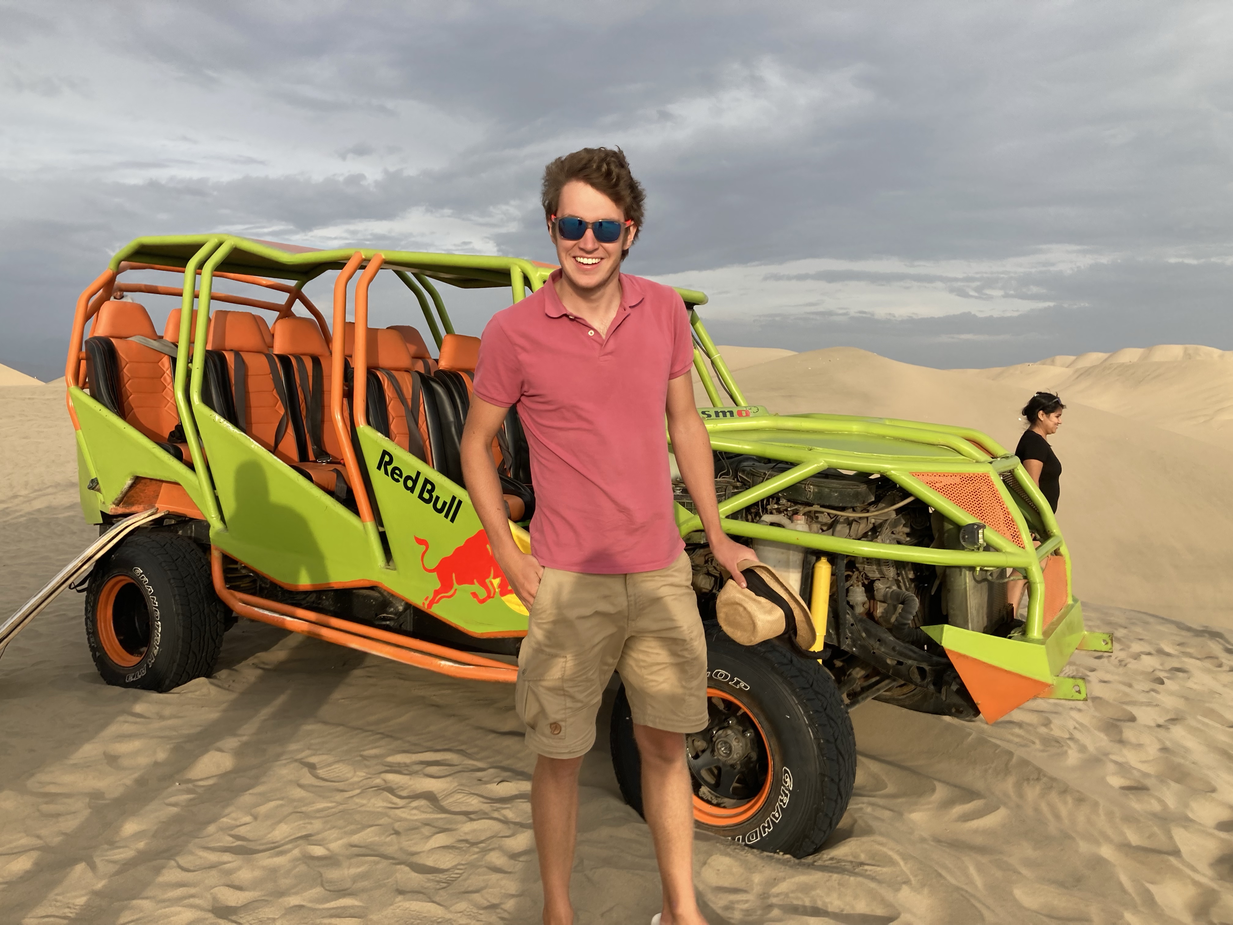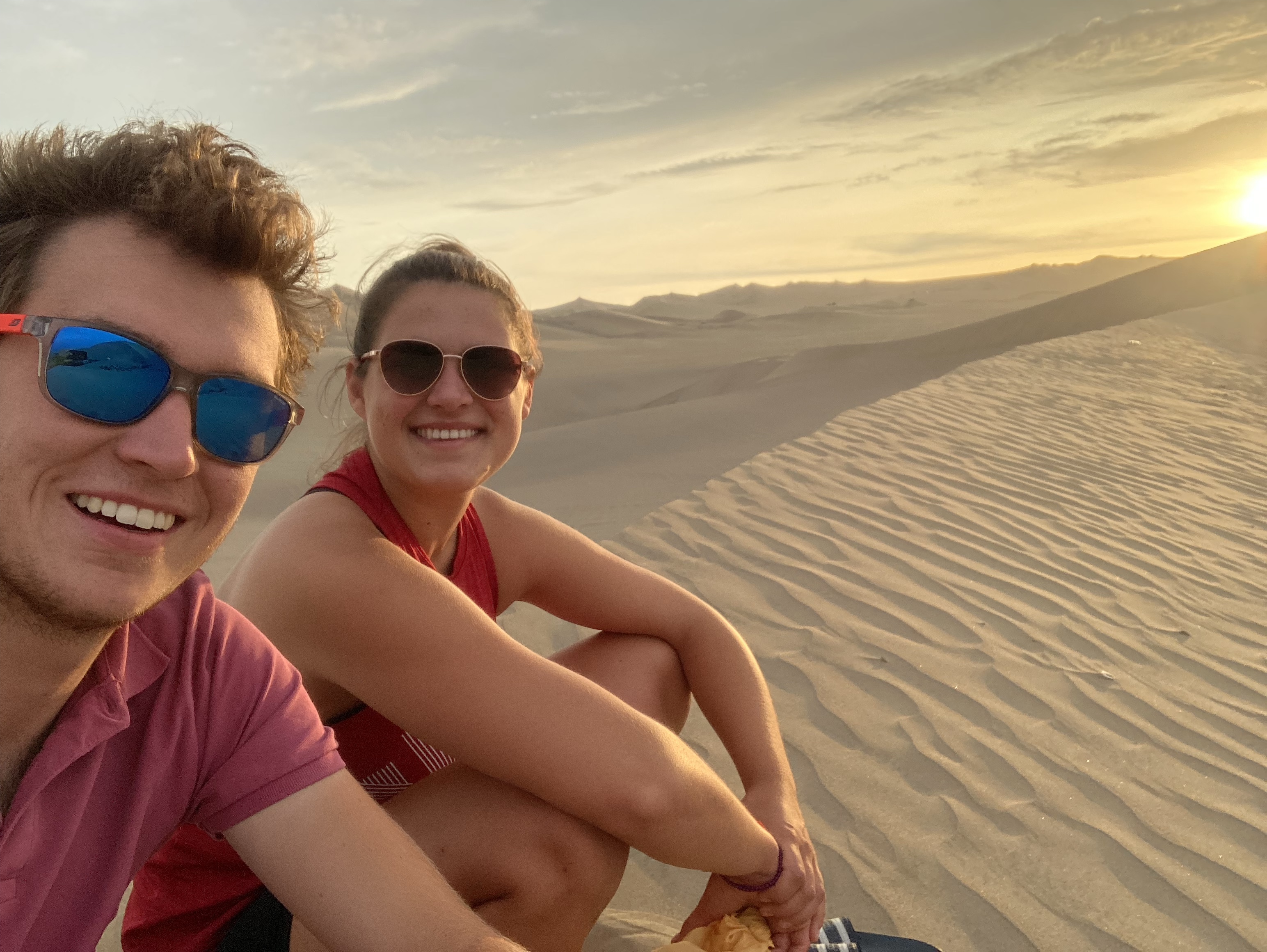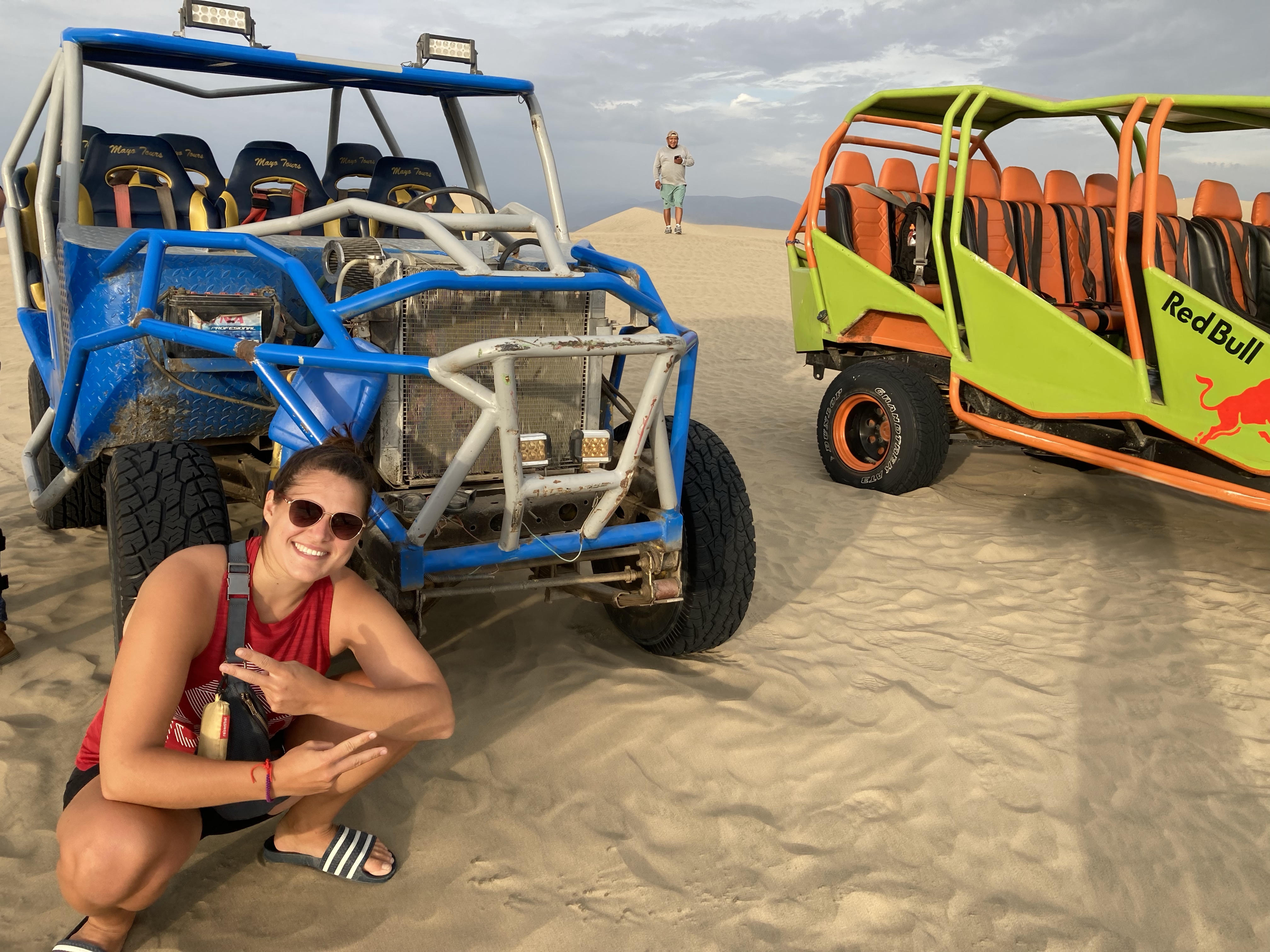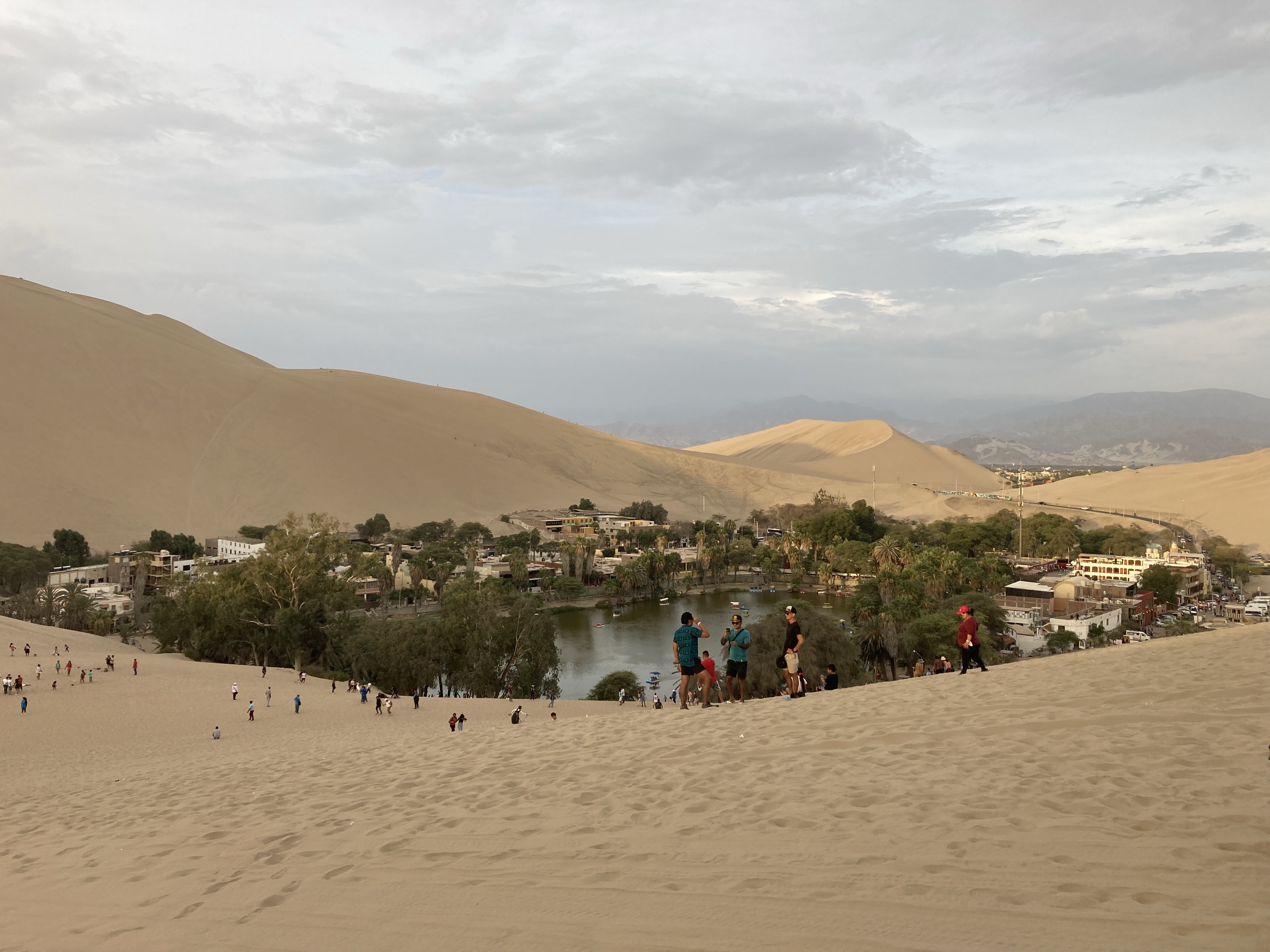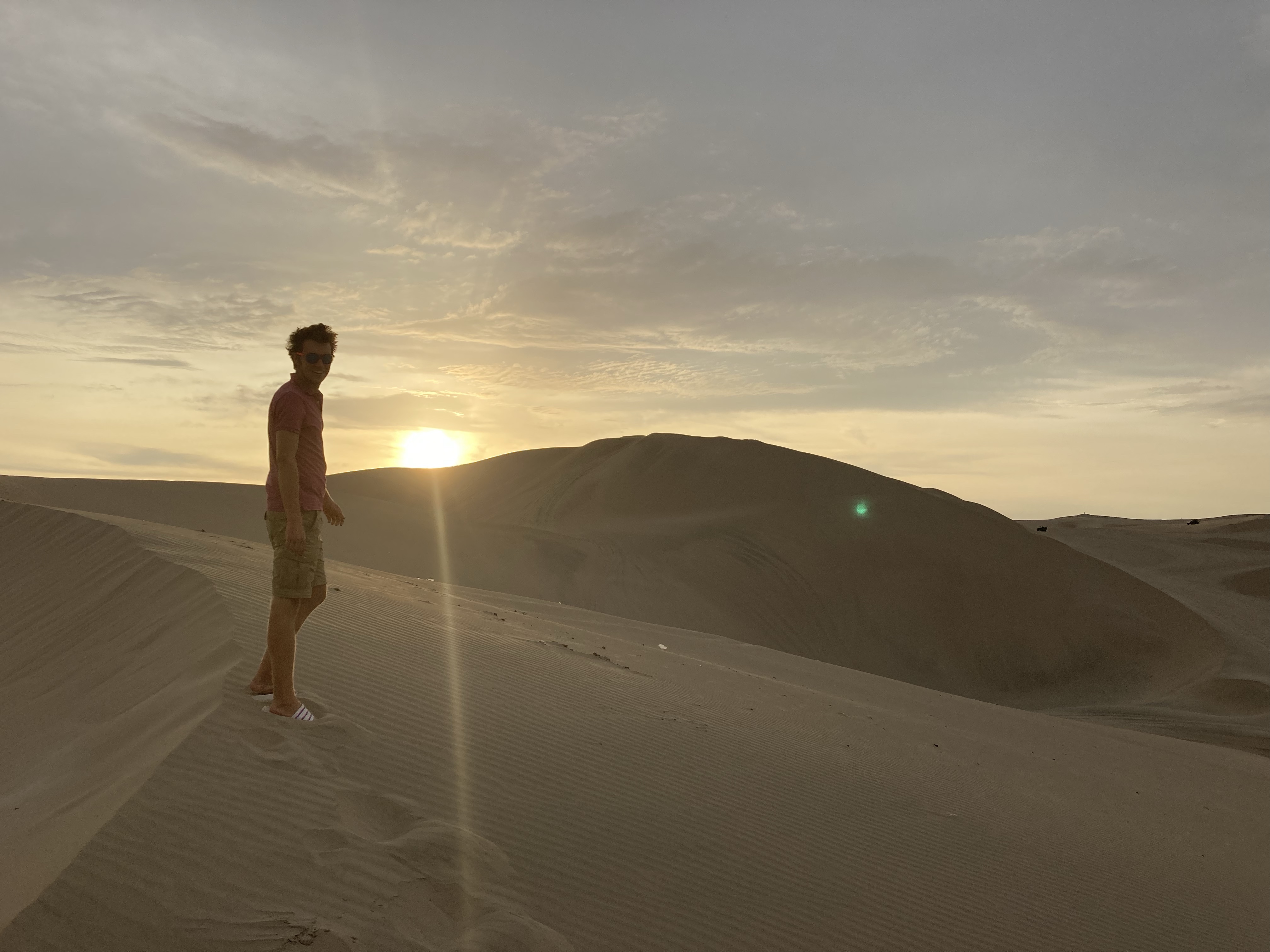 Schon an der Orteinfahrt des kleinen Ortes werden wir von unzähligen Tour-Guides in Empfang genommen, einer lotst uns zu einem Parkplatz. Anschließend möchte er uns eine Tour mit dem Sandbuggy vermitteln. Wir haben eigentlich kein Interesse – wir wollten uns die Oase nur anschauen und ein bisschen durch den Sand spazieren. Der Preis für die Buggyfahrt sinkt so (fast) von ganz allein von 100 Soles um die Hälfte auf 50 Soles (12,50 €). Wir willigen also ein und werden zur Oase und zu einem der ungefähr 50 Buggys gebracht, die neben der Oase parken und auf Touristen warten. Die Fahrt ist rasant und macht viel Spaß. Bei einem Zwischenstopp können wir auf Sandboards die Düne heruntersurfen. Zurück an der Oase bewundern wir den wunderschönen Sonnenuntergang über der Wüste.