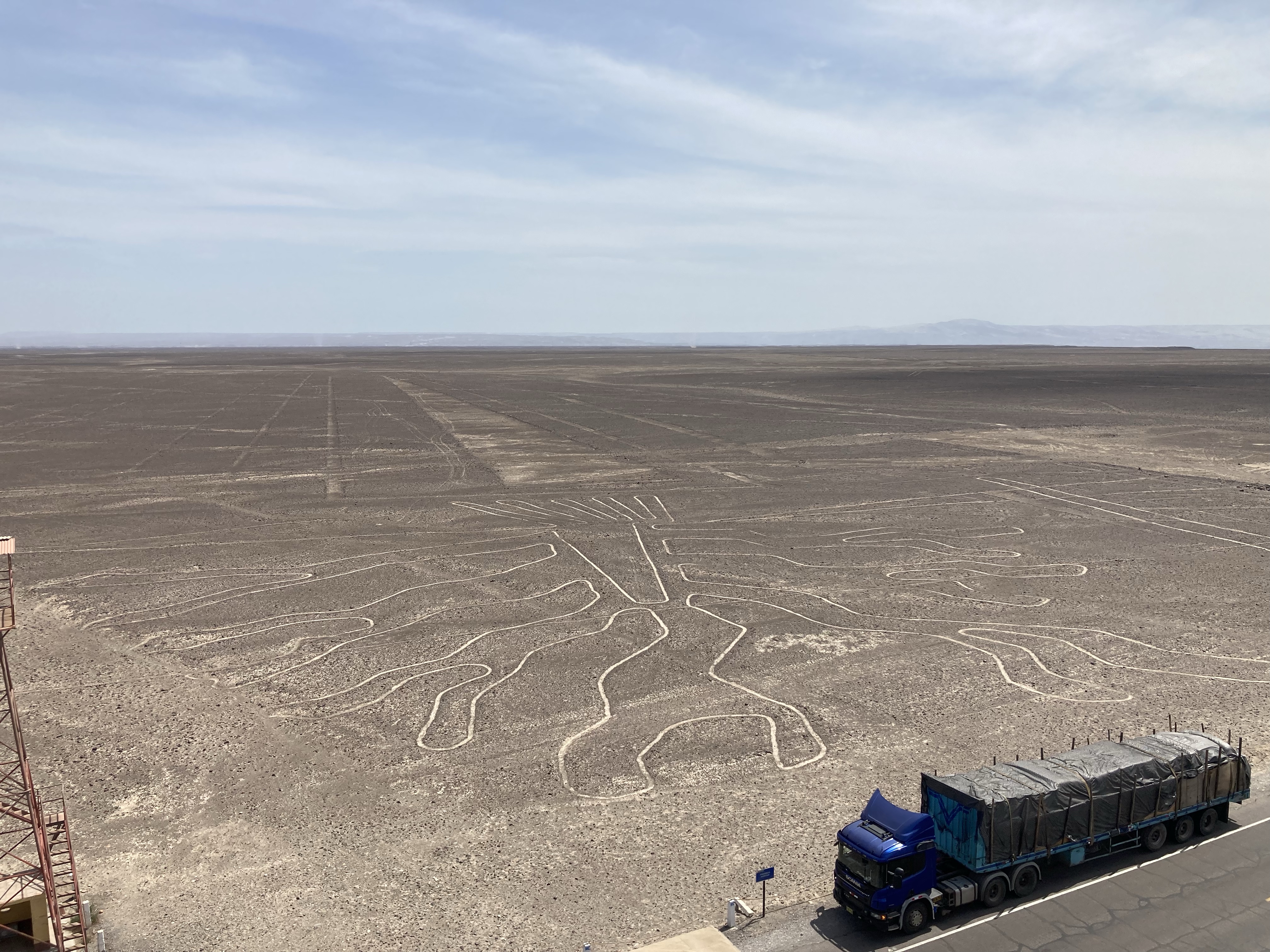 Unser Weg führt uns dann immer weiter an der Küste entlang in Richtung Norden. Wir bringen viel Strecke hinter uns und befinden uns mitten in kargem Wüstenland. Einen kurzen Zwischenstopp machen wir an den sogenannten Nazca-Linien, das sind Geoglyphen oder Scharrbilder, die vor ungefähr 2000 Jahren von der Nazca- und Paracas-Kultur in die Erde gezeichnet wurden. Von Aussichtspunkten kann man ein Blick von oben auf sie werfen. Die Bedeutung der Bilder und zum Teil kilometerlangen geraden Linien ist bis heute nicht ganz sicher geklärt. Wahrscheinlich haben sie einen religiösen Hintergrund und waren Teil von Fruchtbarkeits- und Wasserritualen. Einige Linien haben auch einen astronomischen Hintergrund und geben zum Beispiel Sonnenwendpunkte an.