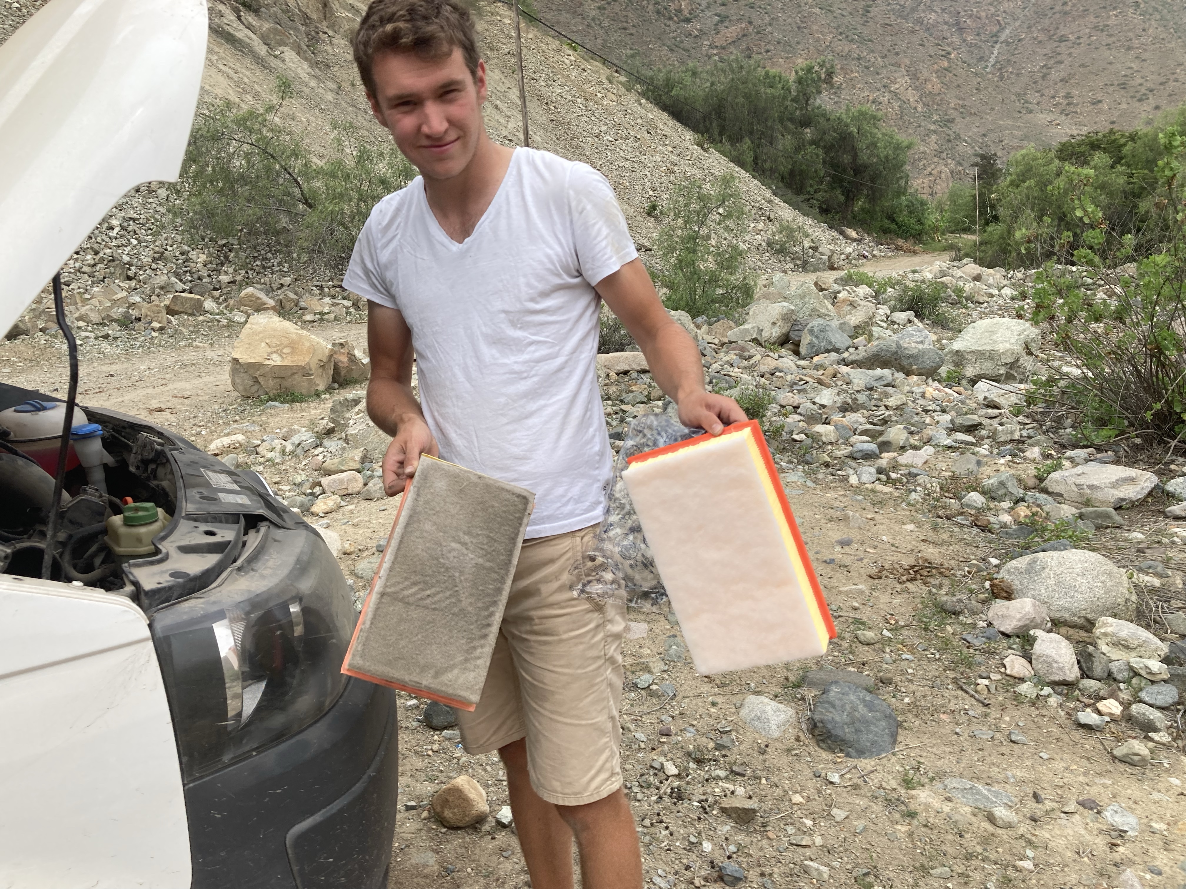 Wir fahren wieder ins Landesinnere, wir möchten uns den Nationalpark Huascarán, rund um den gleichnamigen Vulkan ansehen und wandern gehen. Vorher kümmern wir uns aber um unser Auto, das uns seit fast fünf Monaten als Zuhause dient, ungefähr die Hälfte unserer Reise ist schon vorbei. Der Bulli bekommt deshalb ein bisschen Pflege und ein neues Filterset verpasst. Wir haben jeweils einen neuen Diesel-, Luft- und Innenraumfilter aus Deutschland mitgebracht, die nun eingebaut werden können. Außerdem haben wir in Lima nach ganz schön langem Suchen und einigem Hin und Her neues Öl gekauft, nach ungefähr 20.000 km in Südamerika ist auch ein Ölwechsel mal wieder fällig.