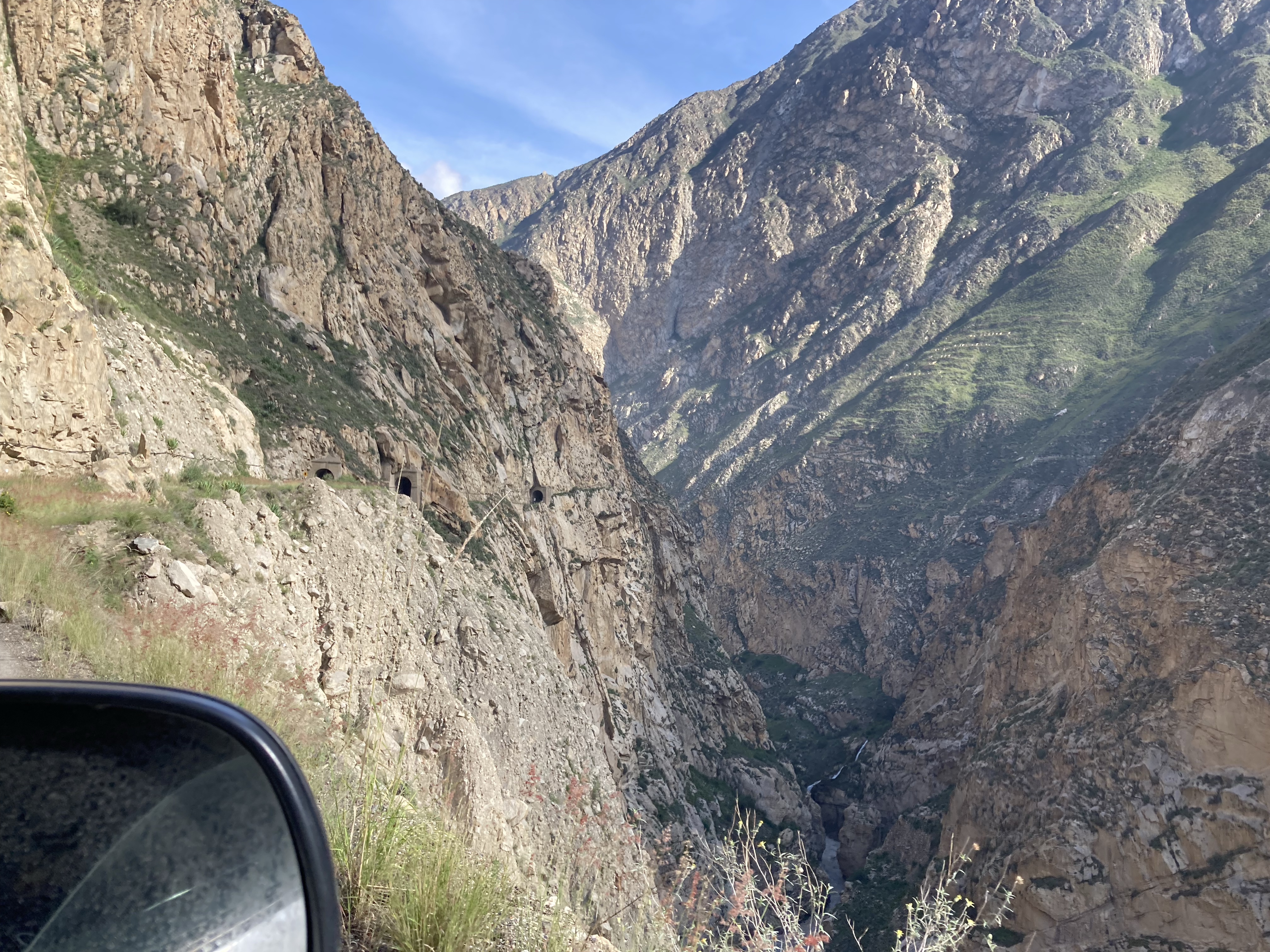 Der Weg aus dem Nationalpark zurück an die Küste führt uns über die bisher wohl beeindruckendste und heftigste Straße. Entlang eines Canyons schlängeln wir uns Höhenmeter für Höhenmeter hinunter ins Tal, rechts von der Straße geht es bis zu 300 m in die Tiefe. Links geht die Felswand hundert Meter in die Höhe. Immer wieder müssen wir Schlaglöchern ausweichen oder Geröll, das auf der Straße liegt. Wir sind froh, dass nichts während unserer Fahrt runterkommt.