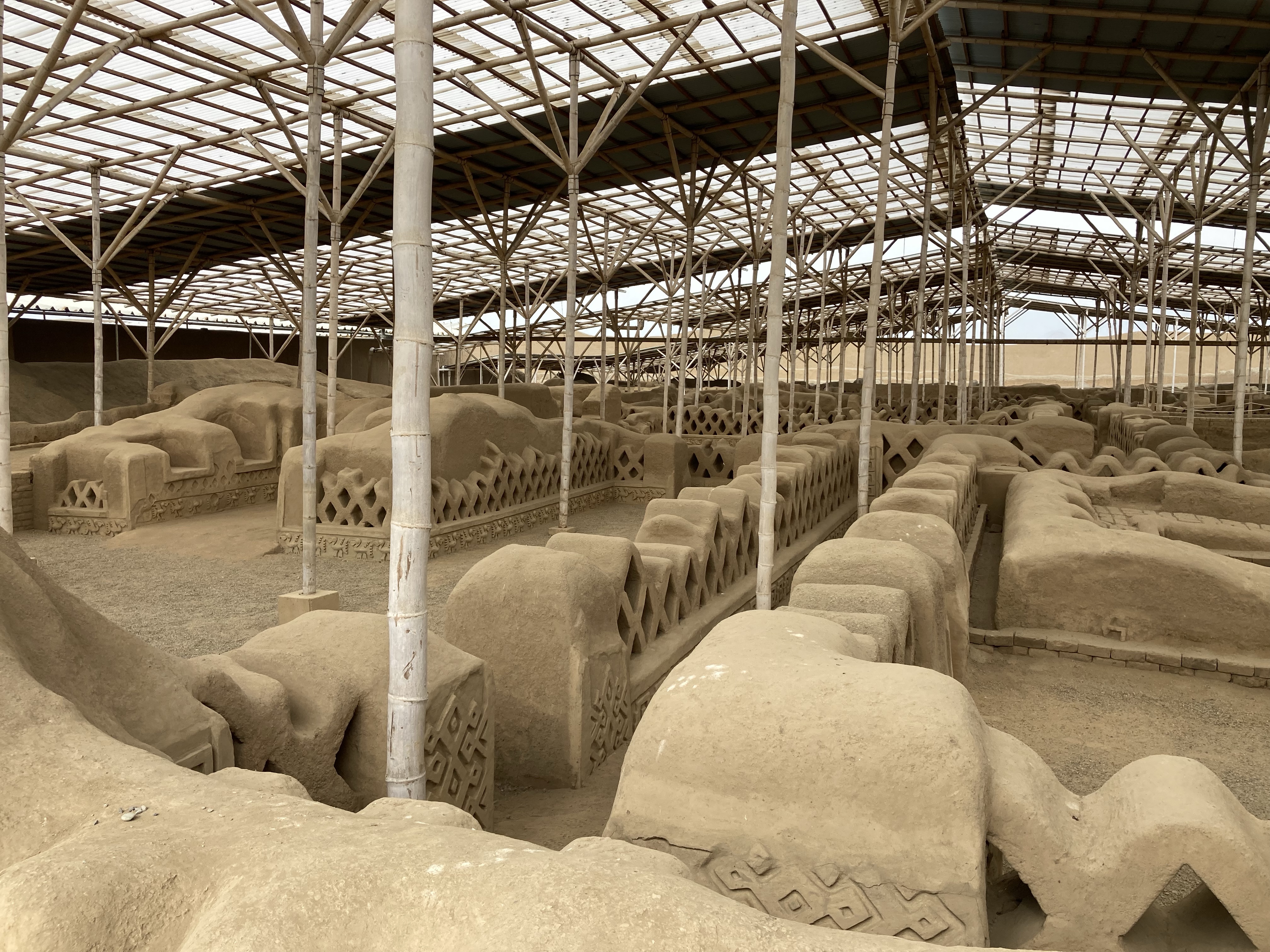 Abends kommen wir in der Stadt Trujillo an, wir sind wieder am Meer. Hier befinden sich die Ruinen Chan-Chan, die von einem großen Volk erbaut wurden und dessen Regiment erst nach langer Belagerung von den Inka gestürzt werden konnte. Kurz vor der Schließzeit führt uns ein Guide durch die alte Lehmstadt und die Tempelanlagen und erklärt uns die durchdachte Infrastruktur und die Kultur des Volkes.